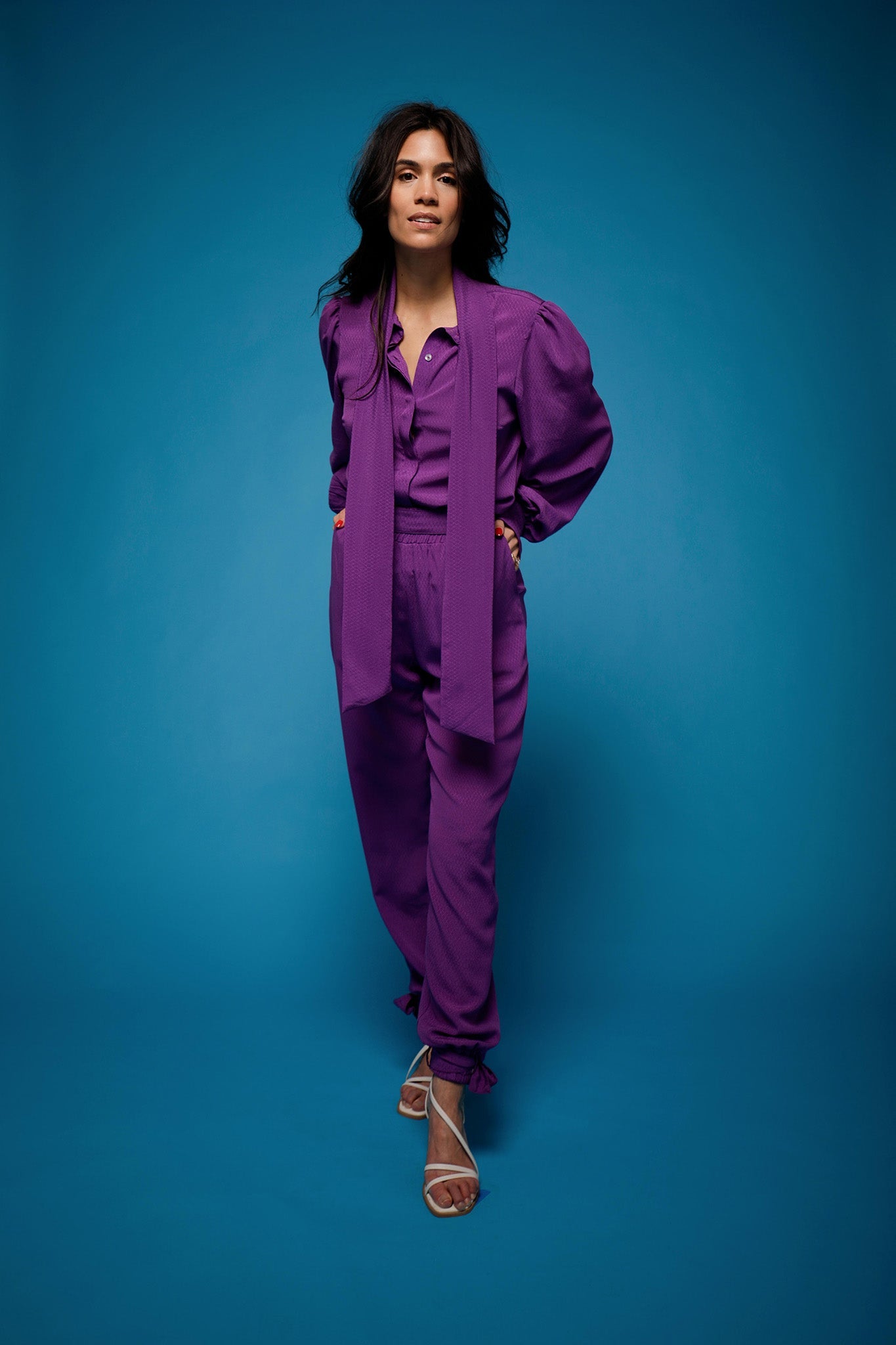 The 'Alejandra' is perfect for comfortable style on the go. This is a lightweight tapered jogger pant featuring distinctive ankle cuff ties and an adjustable waist belt. Perfect to pair with it's matching cami, a blouse for work, or a t-shirt for the weekend. Pictured here with the matching 'Claudia' blouse and 'Clementina' camisole.