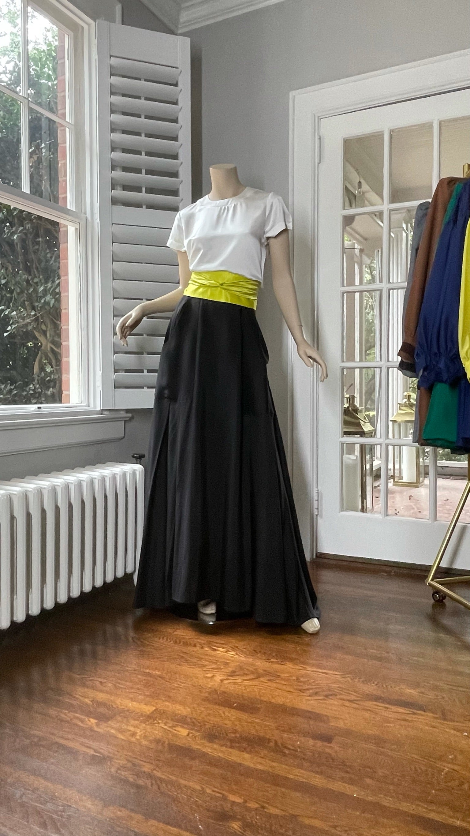 The Gina floor-length skirt is detailed with strategic box pleats, a cinched waist and a belt detail in the rear closure. She features oversized front patch pockets. The Gina is modern luxury, yet classically beautiful skirt. This skirt is perfect for any black tie event.