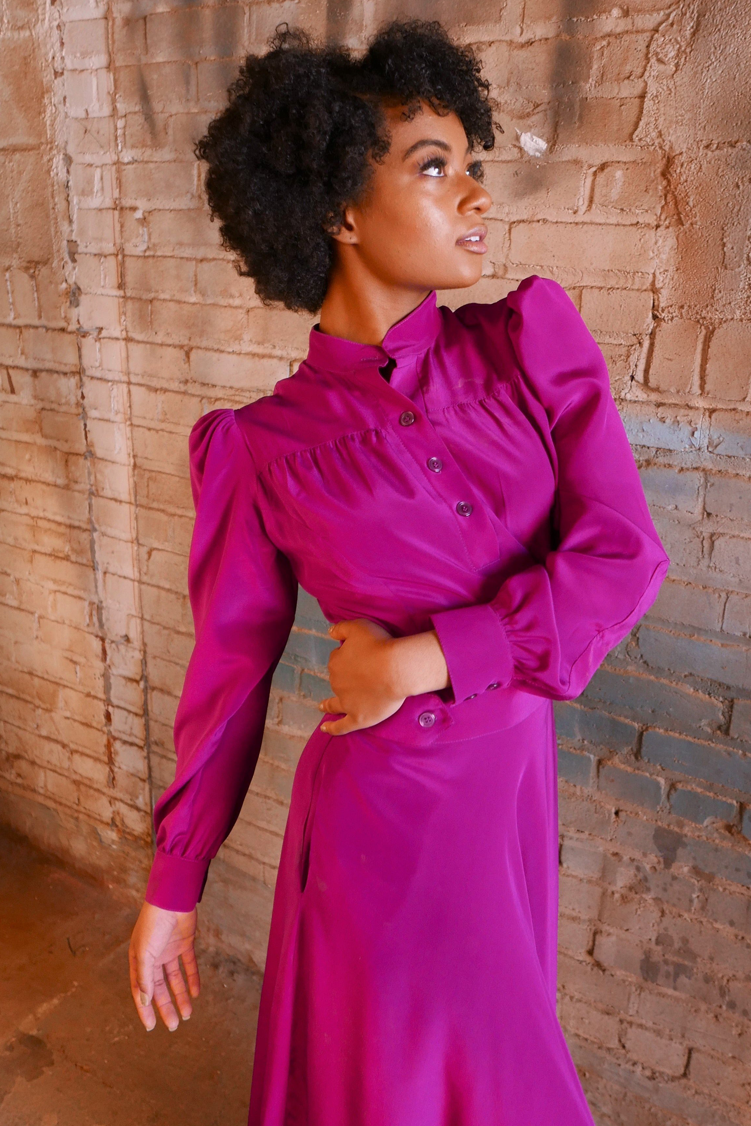 The 'Gloria' midi dress is a modern spin on a classic design. The feminine puffy shoulder and sleeves with mandarin collar evoke the elegance of the 30's movie stars. Detailed with a contemporary front plaquet, a cinched waist featuring waist belt details and a full skirt with side seam pockets, this dress is figure flattering and a show stopper.