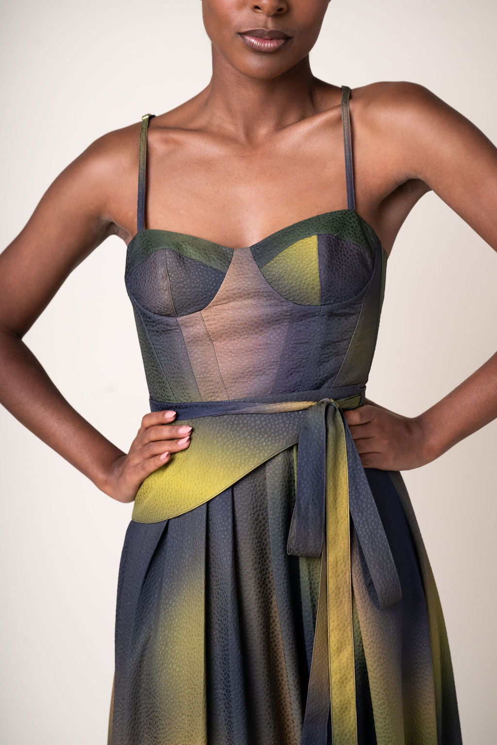 This charming garment features a bustier-style top that exudes structured refinement, complemented by a whimsical swing skirt design. Embrace the freedom as the dress effortlessly flows around you, thanks to its airy construction and breathable material.