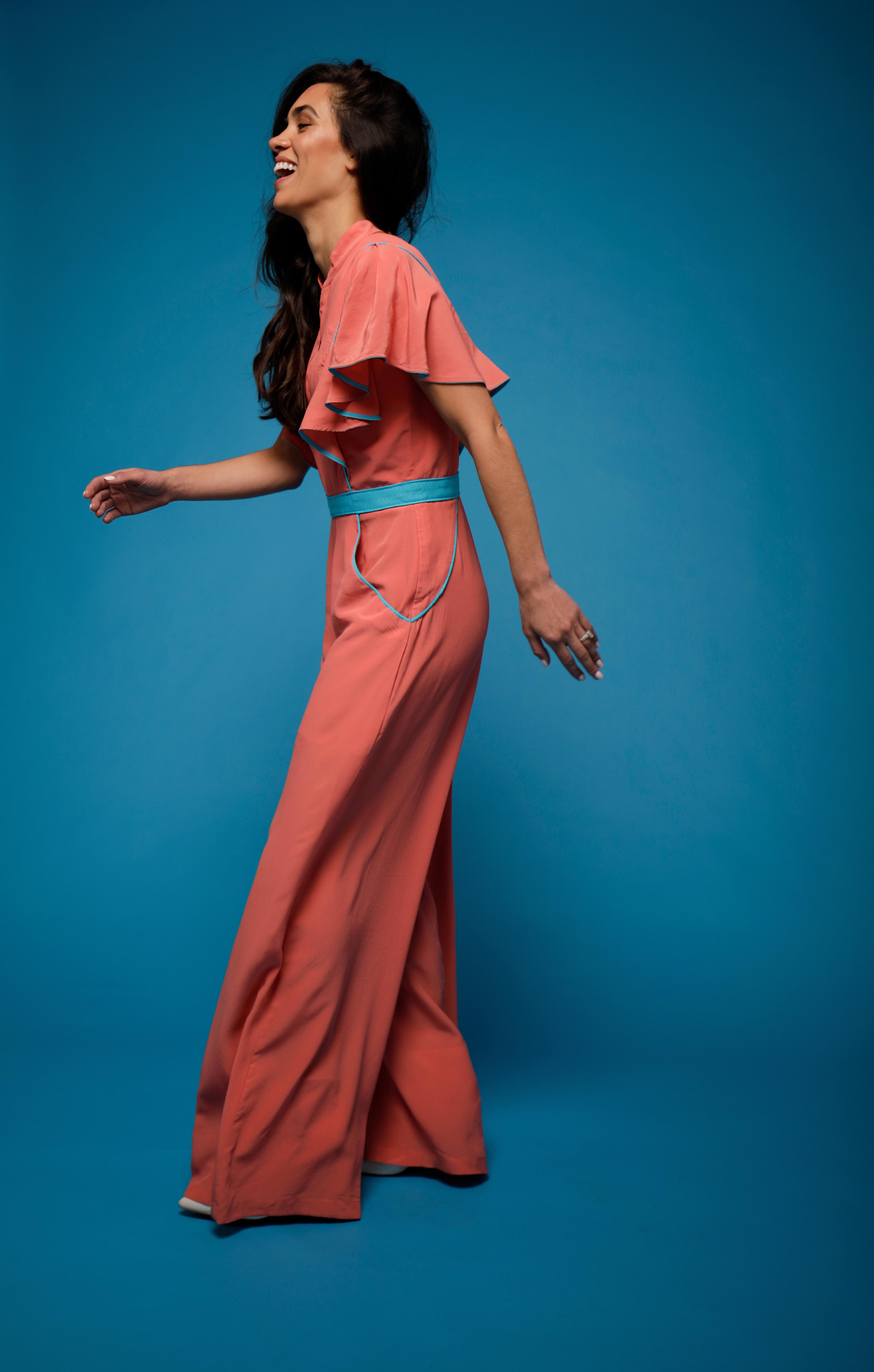 The 'Isabel' jumpsuit is bold and flirtatious just like you. The cheery coral is perfectly accented by a bright blue piping and waistband to create a long slender figure. The material is light, breathable, and flowy and the feminine flutter sleeves and key hole back adds an extra layer of elegance anywhere you wear it.