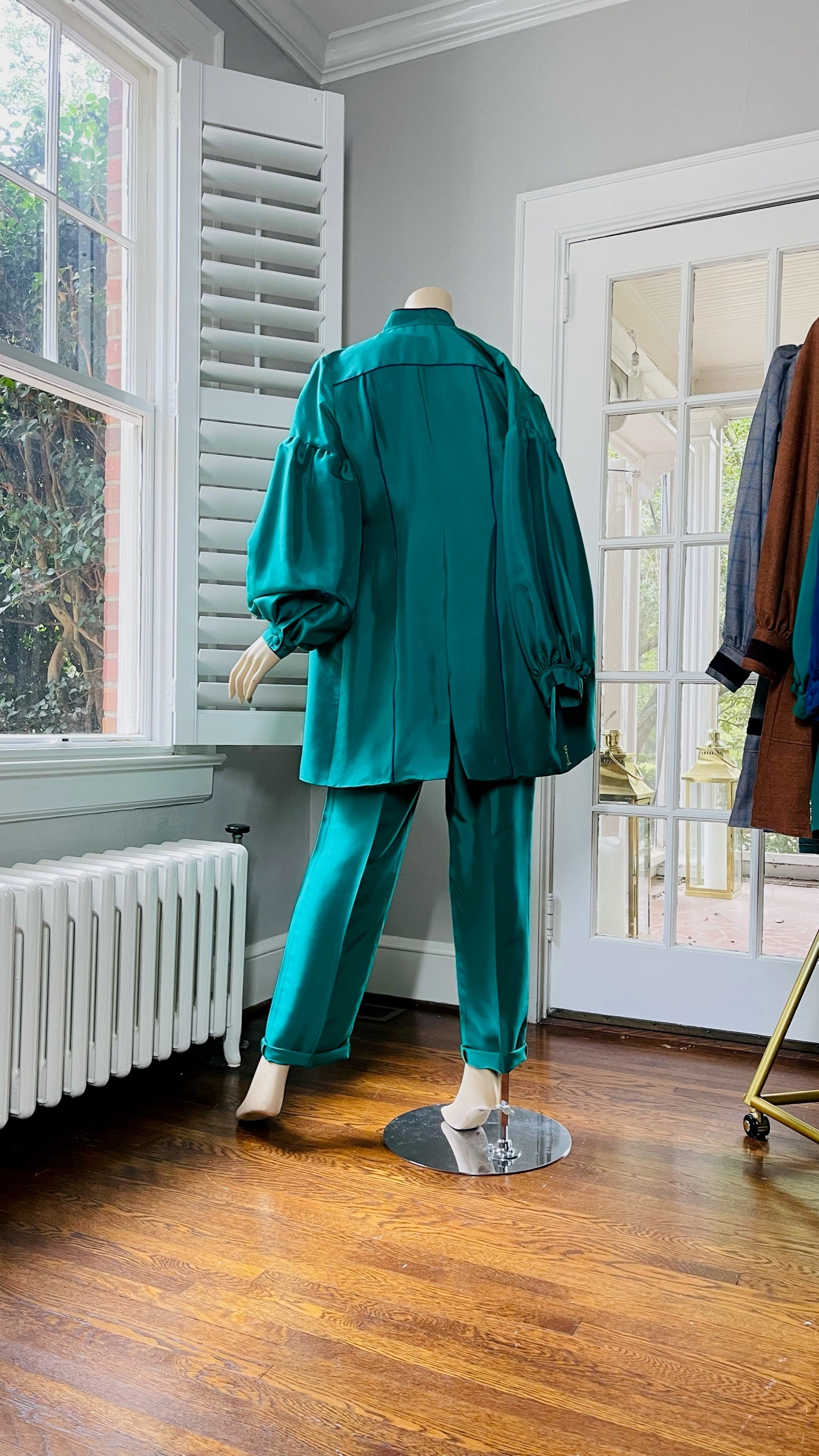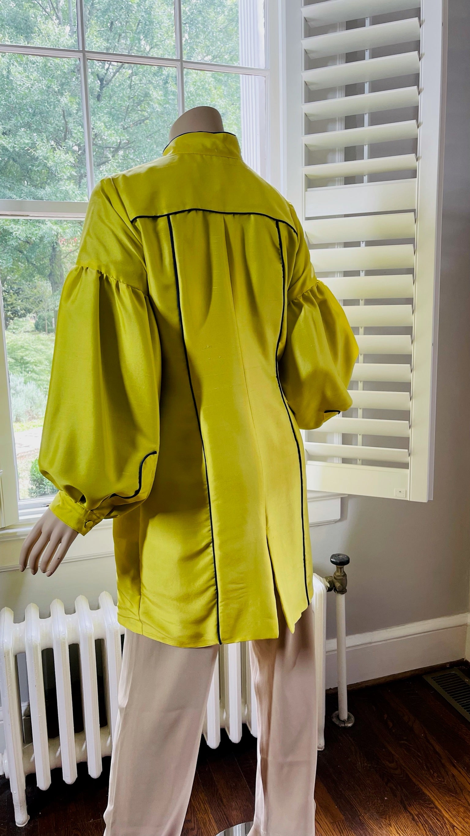The 'Marcela' jacket is made in an elegant Shantung silk and full of beautiful details to enhance your outfit. Closed, it can be worn as a dress with it's mandarin collar and hidden front plaquet closure. The bishop sleeves are detailed with a drop shoulder and one fabric cove