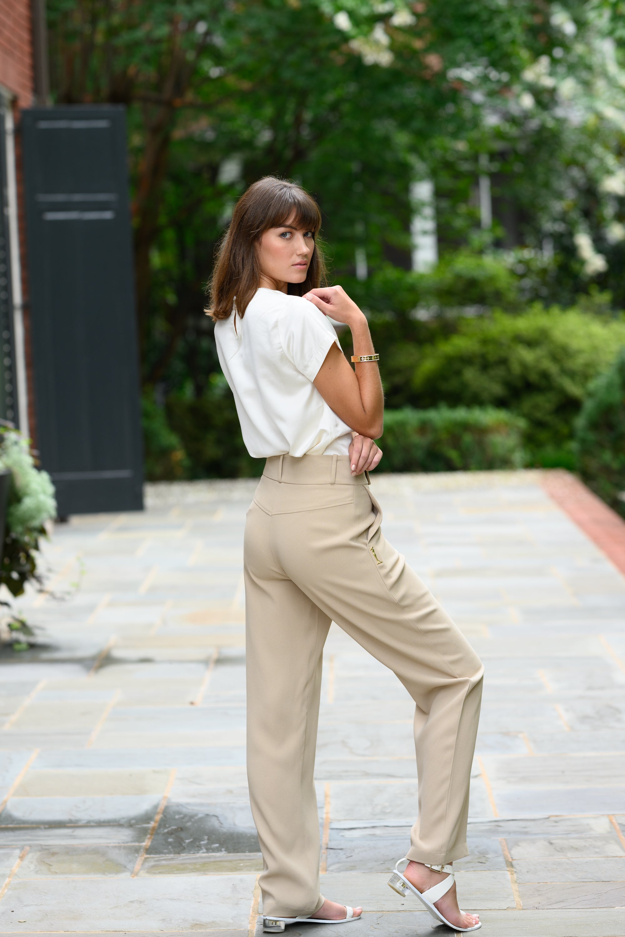 The perfect relaxed trouser has arrived. Our 'Verano' pant is a high-waisted, straight-fit crepe trouser. These relaxed comfortable pants are made from an exquisite crepe that is thick for coverage but breathable for warm days. Available in bright summer yellow and a light cafe con leche and pictured here with the 'Lotus' silk t-shirt and 'Silvana' crop.